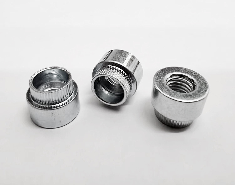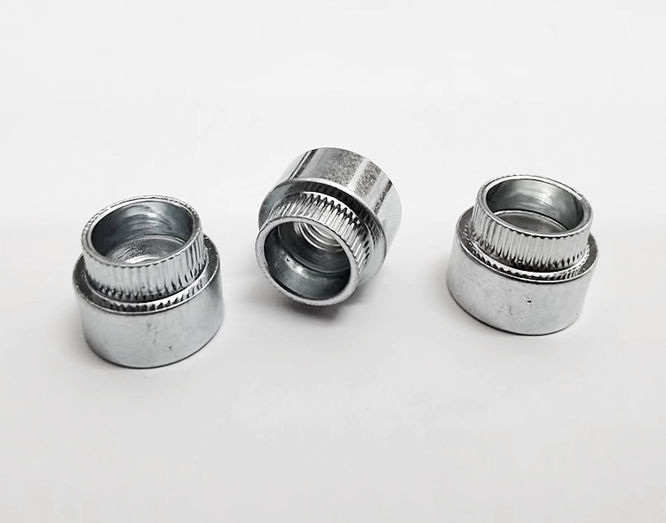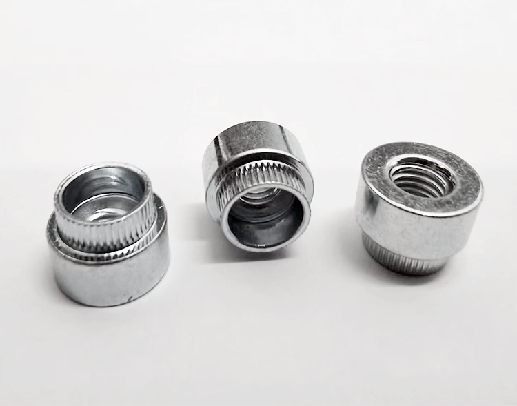 產品特點:壓進板內的都是圓型,無內牙。一般在薄板上預先開好板孔,將漲鉚螺母放進板孔內,用治具將無內牙的部分從內往外漲從而使漲鉚螺母與薄板緊密鉚合。漲鉚螺母一般不加硬,從而保證其韌性,用治具漲的時候,既能使元件漲鉚緊,又不至于把元件漲裂。